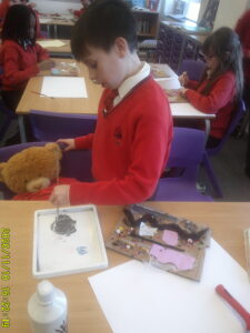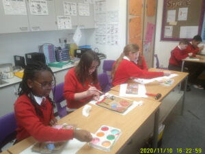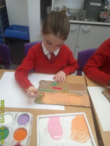 Y6 have been studying Retro-futuristic pieces of art. They made printing plates from different textured materials and used them to print a patterned background. Next week we will be sketching our ideas about the future to use on the foreground of our piece of art.